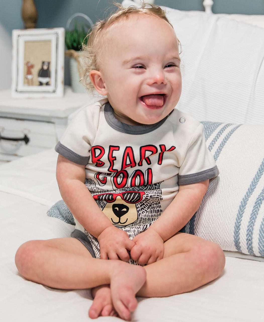 You know your little one is super cool. Let everyone else know with our Beary Cool Infant Creeper Onesie. Made with ribbed cotton for stretch, your child will have lots of room to move around! With snaps at the crotch and shoulder for easy changes! Let your little one be the coolest one in your crib.