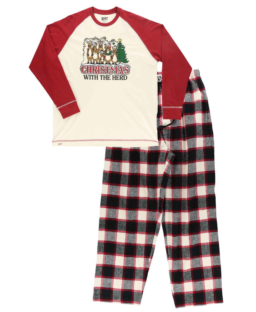Add some fun to your Christmas parties this year with our Christmas with the Herd men's pajama set. The men's pj tee is off white with red raglan sleeves and a fun Christmas reindeer, and their thinner fabric makes this tee great to sleep in. Made from soft, cozy flannel, these roomy flannel pants are cut for men and women. PJ Pants have a button fly, a drawstring, pockets and encased elastic waistband for a relaxed fit. Purchased as a set. Adult sizes: XS-XXXL