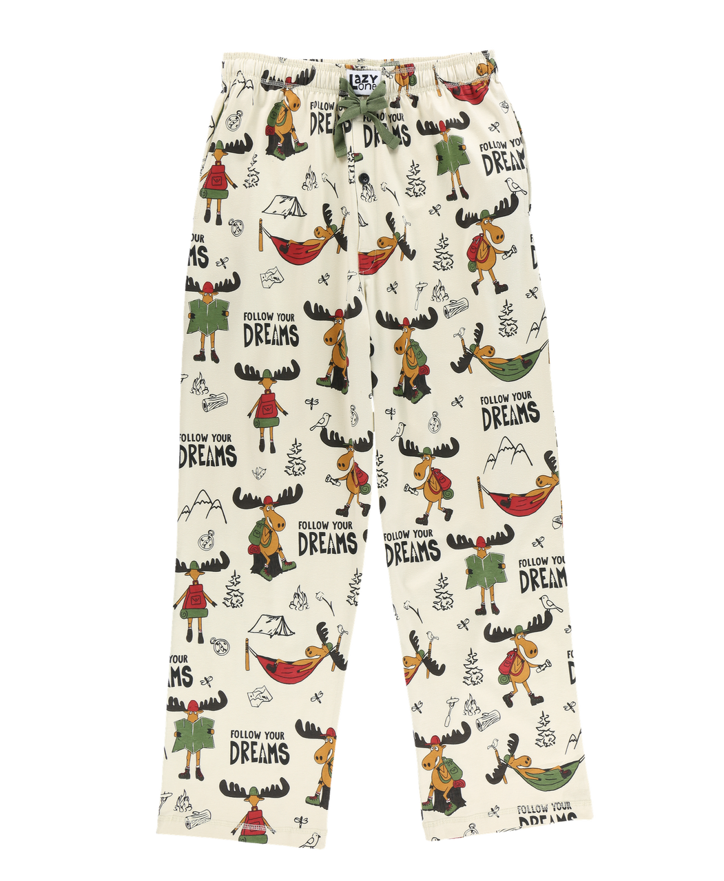 Get out there and follow your dreams and follow them in all the comfort of our Follow Your Dreams men's pajama pants. These pajama pants feature a cute hiking moose design any hiker or adventurer would love. Made for both men and women, these roomy pajama pants are made with 100 combed cotton and have a fly, drawstring, and pockets.