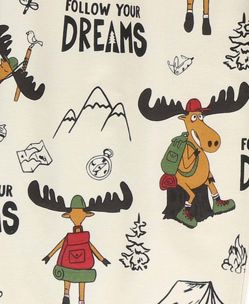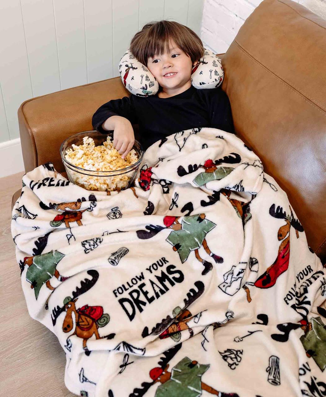 Dream big and stay cozy with our Follow Your Dreams Blanket! This blanket is the perfect companion for those who love adventure and the great outdoors. With a cream-colored background, it features an adventurous moose hiking through scenic mountains, maps, and glimpses of acorns, trees, and other wildlife, reminding you that every journey begins with a dream.