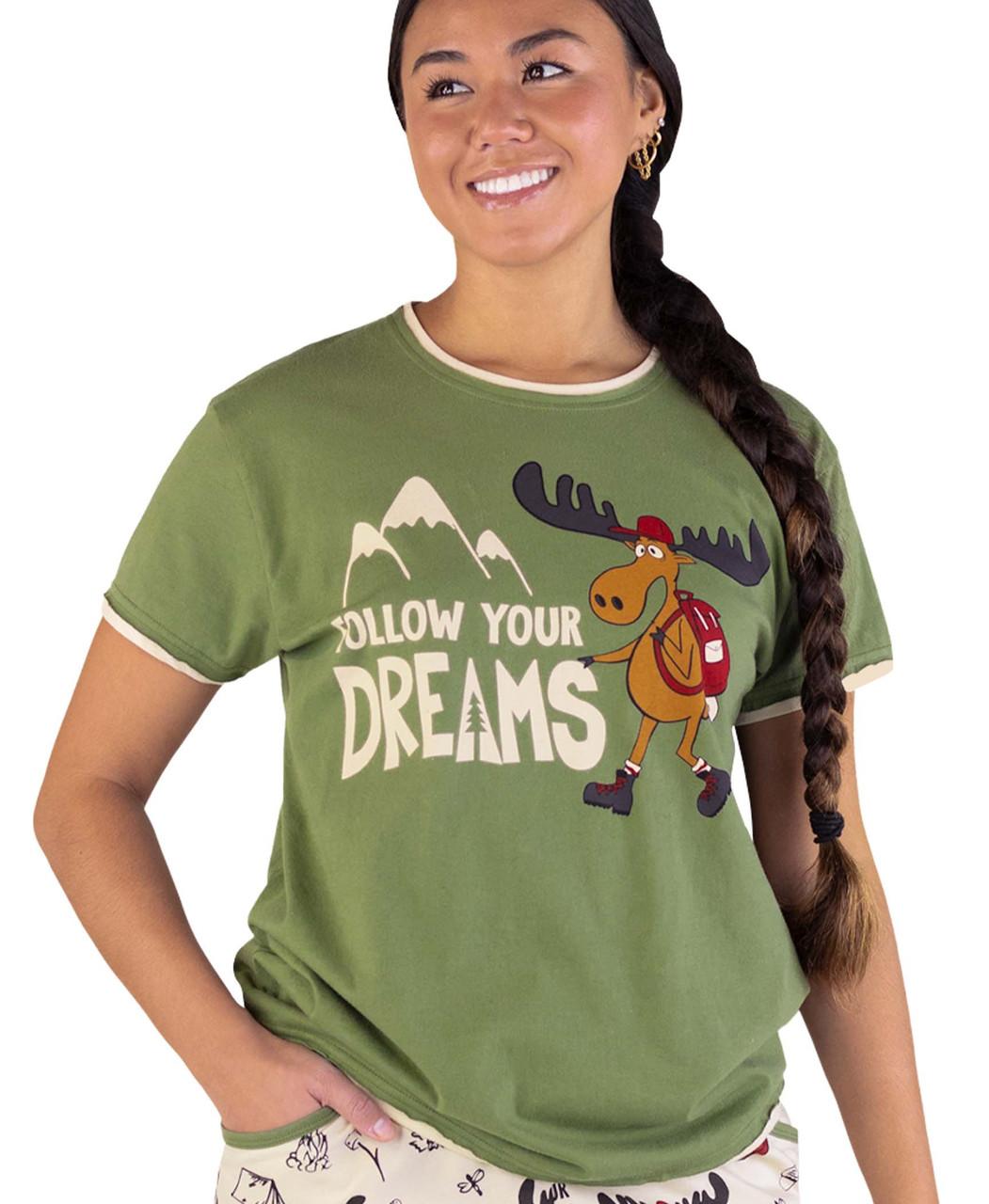 Get out and follow your dream where ever they may take you in our Follow Your Dreams women's pajama tee. Our Follow Your Dreams pajama tee has a cute outdoor moose ready for their next great adventure. Any adventurer on your shopping list will love this cute and comfy pajama tee. Our Pajama tees are made from breathable 100% combed cotton for a soft blend of warmth and comfort, each tee features raw-edged trim around the neck and sleeve. Matching pj pants can be purchased separately.