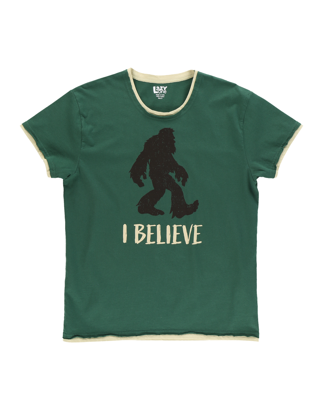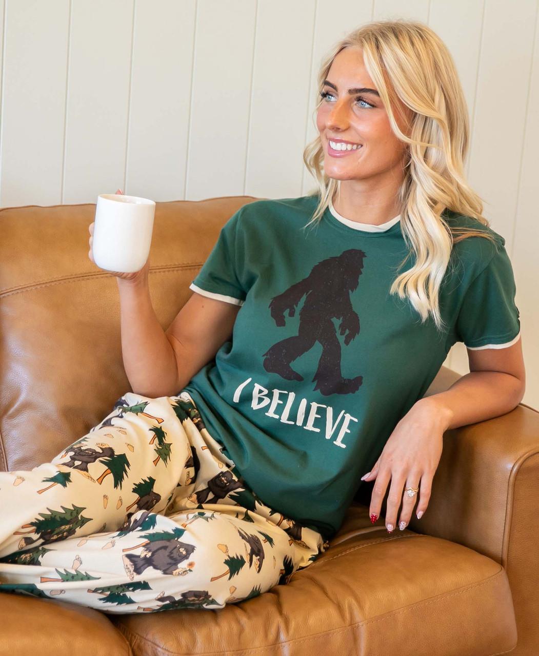 You won't believe all the comfort and joy you will bring the bigfoot lover in your life with our I Believe Squatch women's pajama tee. Made from breathable 100% combed cotton for a soft blend of warmth and comfort, each tee features raw-edged trim around the neck and sleeve. Matching pj pants can be purchased separately.