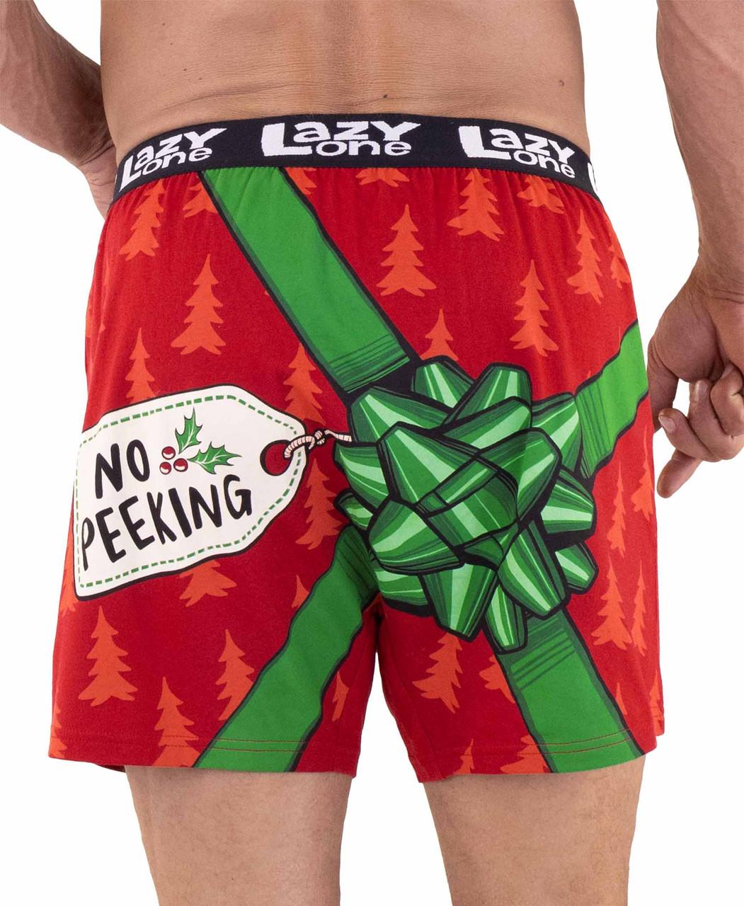 Add a special present under the Christmas tree this year with our No Peeking men's boxer. With it's funny Christmas wrapping design it will sure put a smile on anyone's face. Made from soft 100% combed cotton knit, our boxers have a roomy fit with a button fly and an plushed-back elastic band.