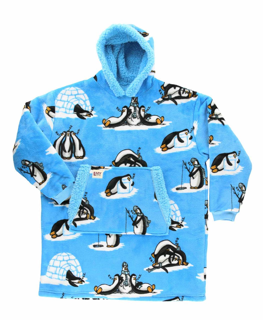 Make sure your kids relax in style with our comfy Out Cold kids blanket hoodie. Our Out Cold kid blanket hoodie features a fun all over penguin design perfect for anyone. Our kid blanket hoodies are a cute over sized hoodie that is one size fits all. Making it the perfect gift for anyone! Our Kid Blanket Hoodies are made with 100% super soft coral fleece, making them perfect for snuggling on the couch on a cold day. They also feature big kangaroo pockets perfect for those late night snacks!