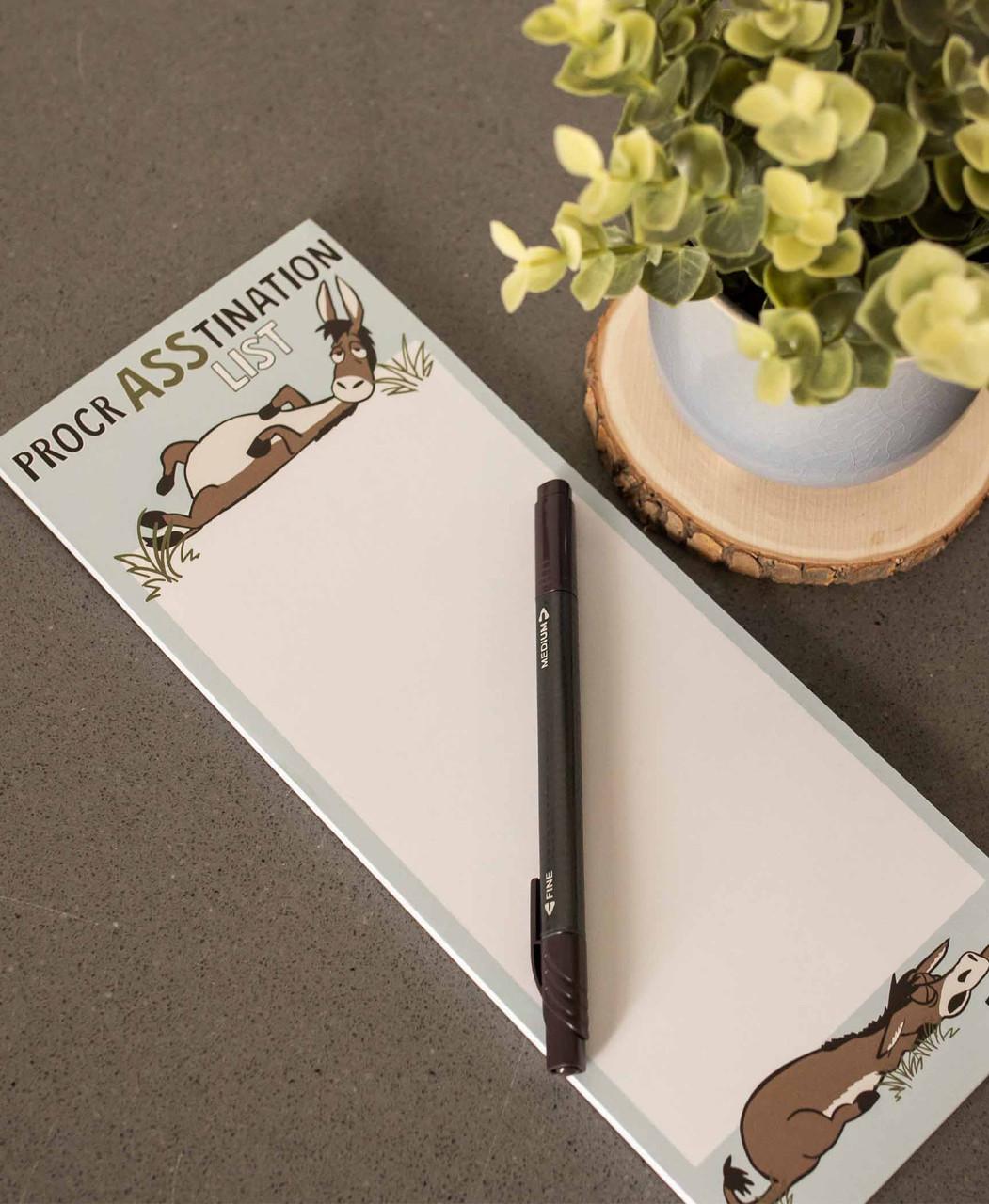 Have fun making your to do list with our ProcrASStination List notepad. This funny notepad features a cute and fun donkey design. Each pad is backed with a strong magnetic strip and comes with fifty sheets of easy-to-tear paper.