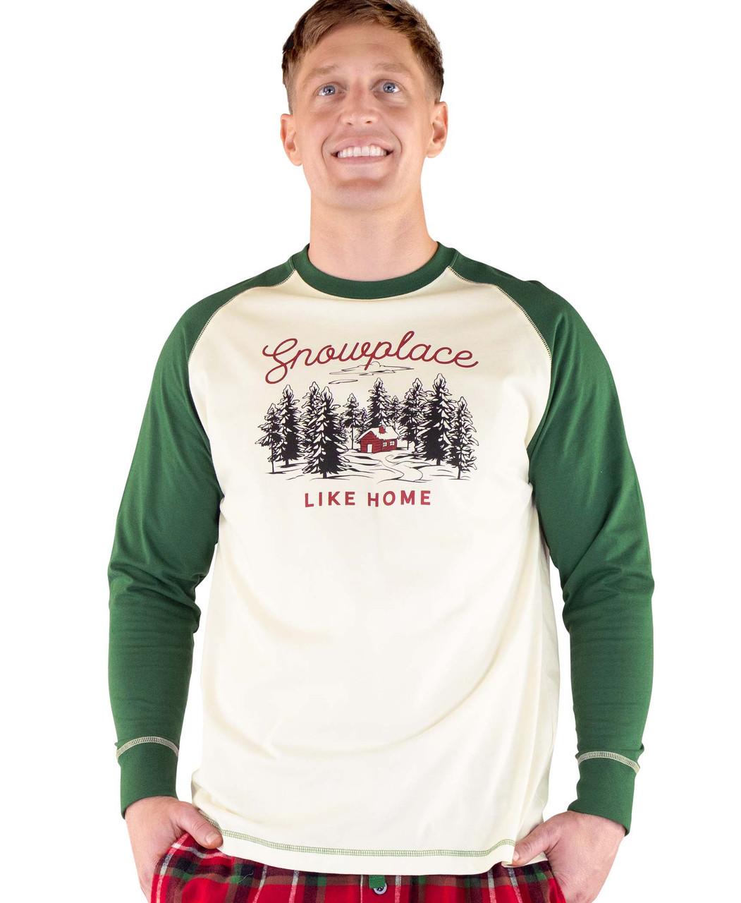 After a long day it's nice to come home and relax. Relax in all the comfort of our Snowplace Like Home men's long sleeve pajama tee. This roomy men's pj tee is white with green raglan sleeves, and their thinner fabric makes this tee great to sleep in. Matching pj pants can be purchased separately. Adult Sizes: XS- XL