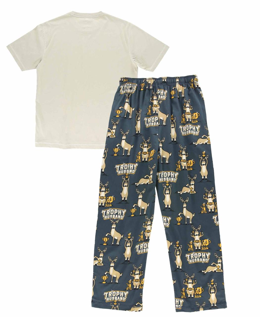 Win the the gifting season with our Trophy Husband men's pajama set. Your husband will love the cool comfort this pajama set brings and it's deer and trophy design. This Set features a roomy men's light grey pj tee and their thinner fabric makes this tee great to sleep in. Pants have a fly, a drawstring and pockets. Purchased as a set. Adult sizes: XS-XXL